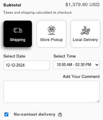 • If you have enabled the ‘No-Contact Delivery’ for the Cart page, the customer will get the No-Contact delivery option selected, or the customers can enable manually. The customers can read the instruction by hovering mouse on the toggle icon (?) (tooltip)