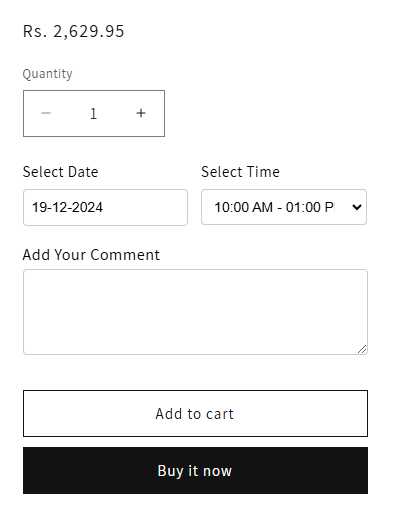 • Like the ‘Product page’, if you have enabled the ‘Delivery date selection’ for the Cart page, the customers will get the delivery date selection on the product detail page with the Additional Note text box and the text caption.