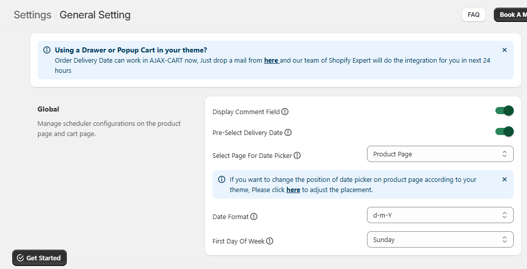 • Product Page –  Select this option to provide a Date Picker section for delivery on the Product page.