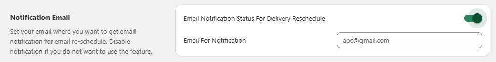 • Notification email button : Toggle to Enable and insert your email in the “Email for Notification” section to get email notification related to delivery reschedule.