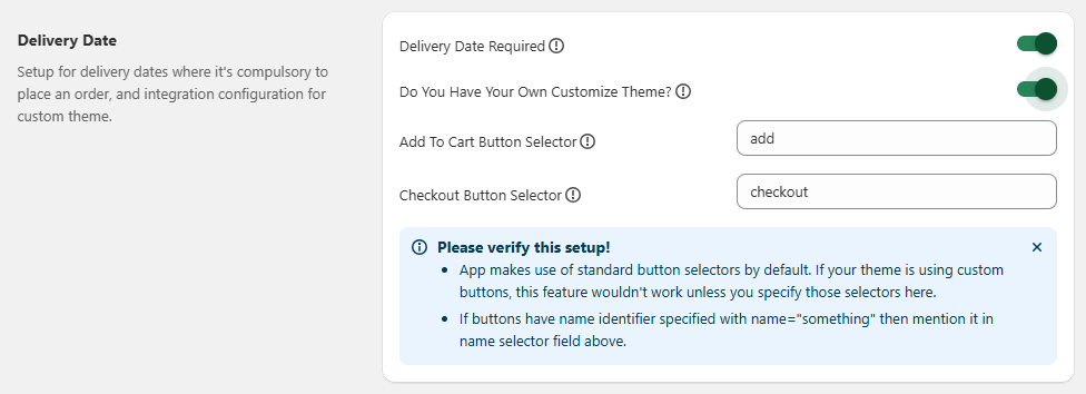 Step 2 Do you have your own customized theme? – When enabled, we will be requiring your customized name attribute value for add to cart & checkout button to place our delivery date picker properly :