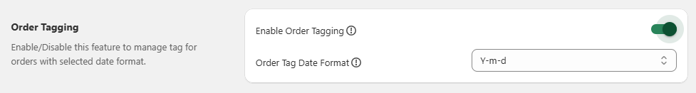 • Enable Order Tagging : Toggle to Enable to manage tags for orders.