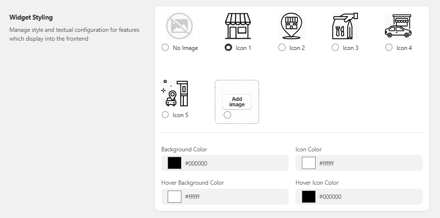 The Widget Styling section contains various icons to choose from for Store Pickup along with configuring Colors for Background, Icon, Hover Background and Hover Icon.