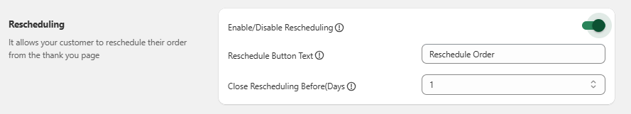 Enter the text further for Reschedule Button and then add the days before which you need to close the rescheduling in Close Rescheduling Before.