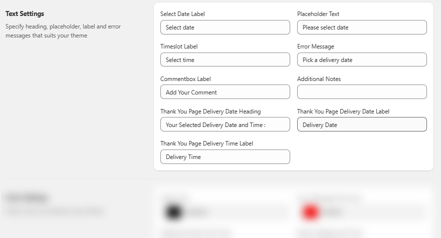 In Text Settings, you can customize the following headings, placeholder, labels and error messages: Select Date, Placeholder Text, Timeslot, Error Message, Commentbox, Additional Notes, Thank You Page Delivery Date Heading, Thank You Page Delivery Date Label and Thank You Page Delivery Time Label.