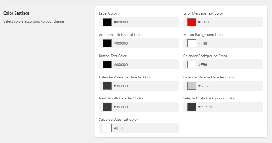 Subsequently, you can set the colors for Label, Error Message Text, Additional Notes Text, Button Background, Button Text, Calendar Background, Calendar Available Date Text, Calendar Disable Date Text, Next Month Date Text, Selected Date Background and Selected Date Text.